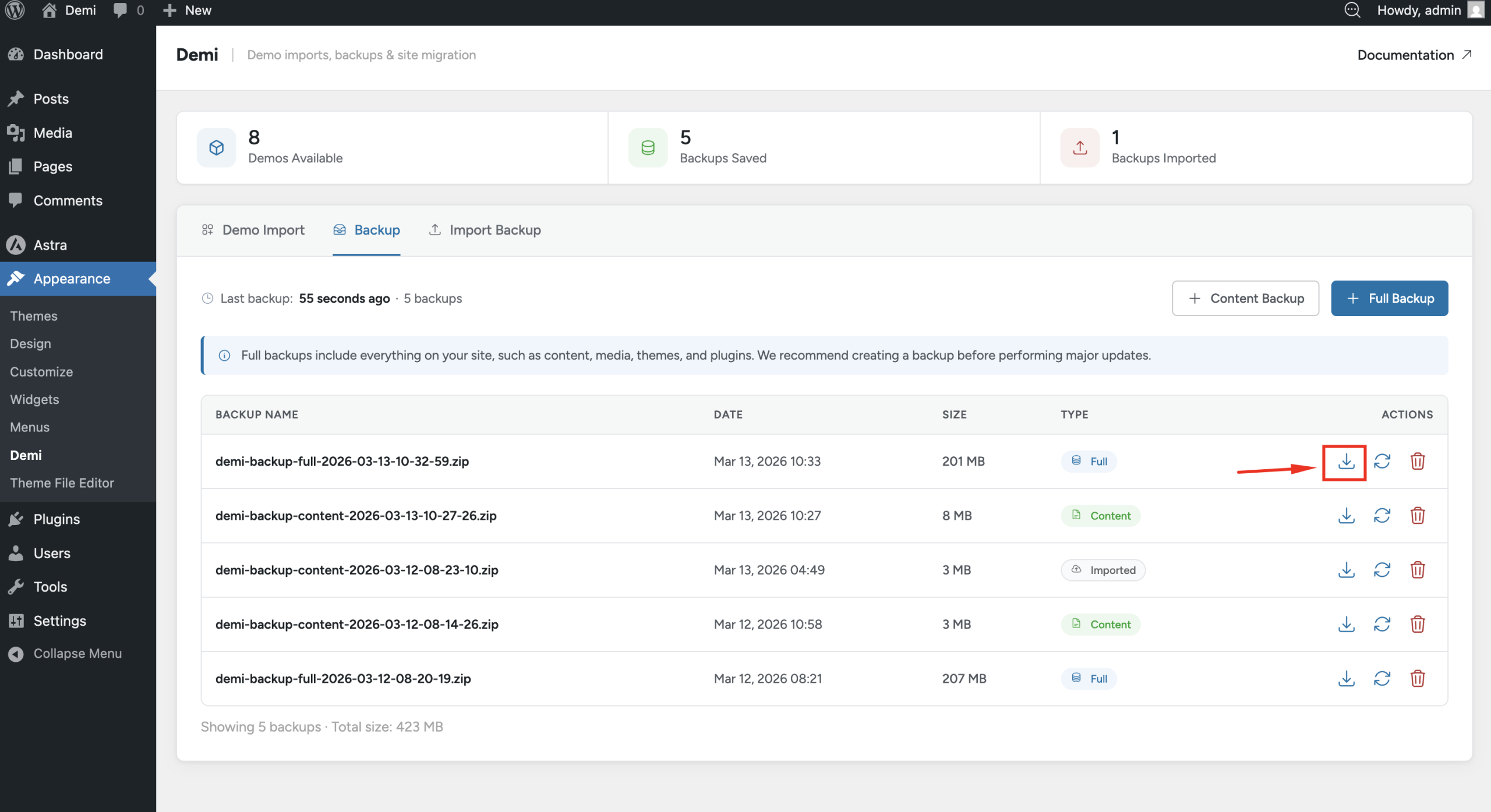 - Navigate to Appearance → Demi → Backup.
