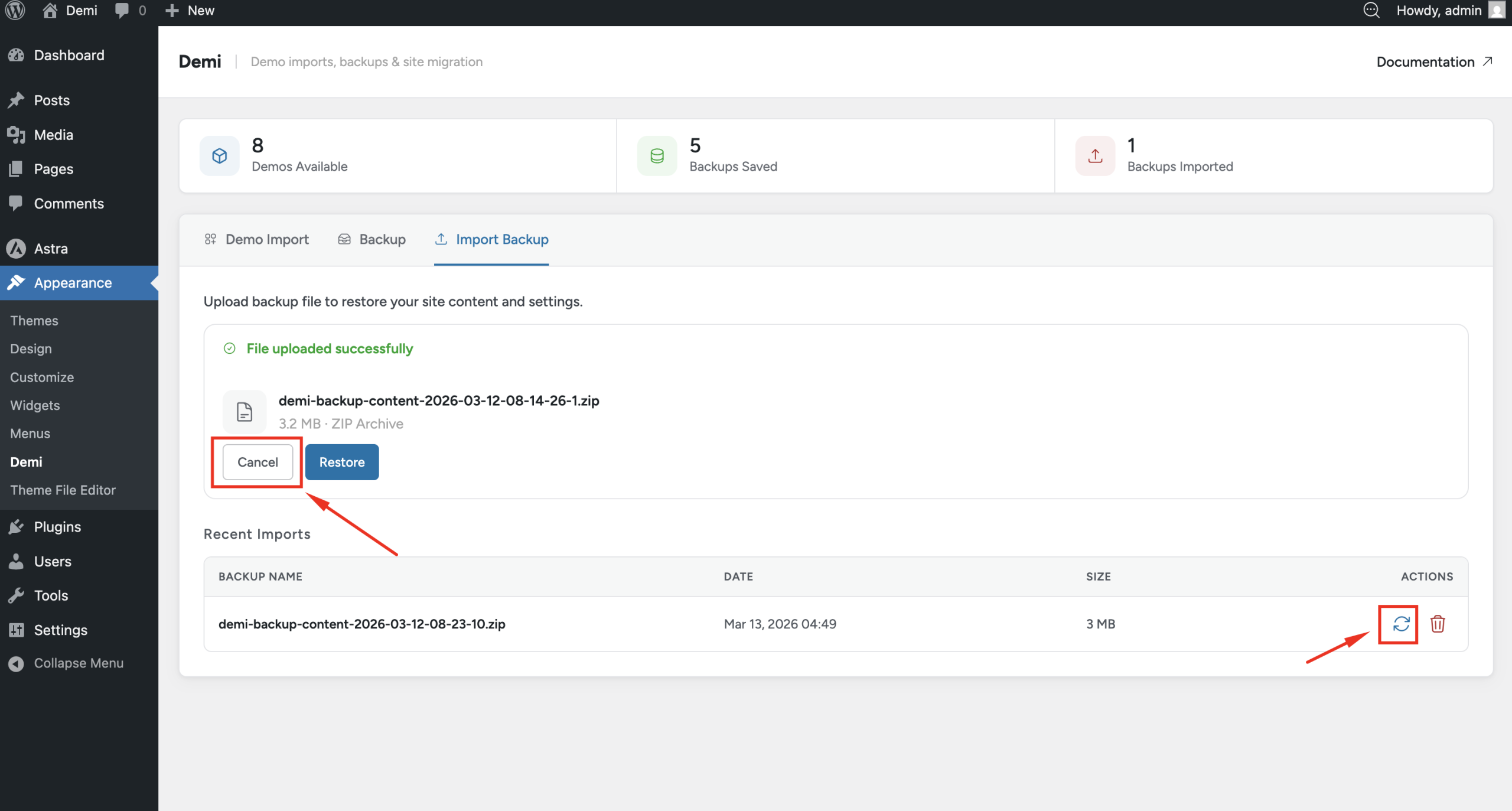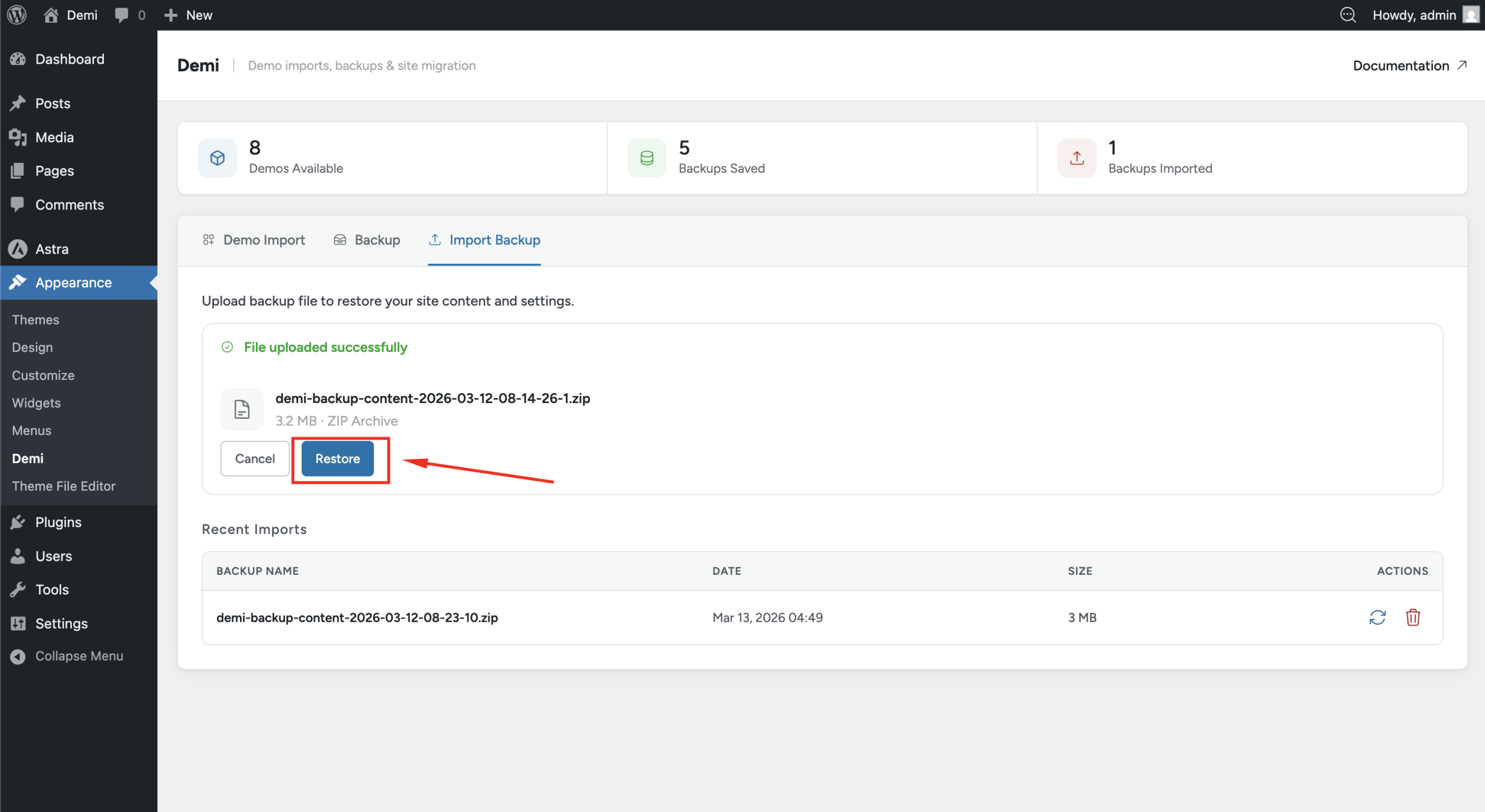 - Navigate to Appearance → Demi → Import Backup.